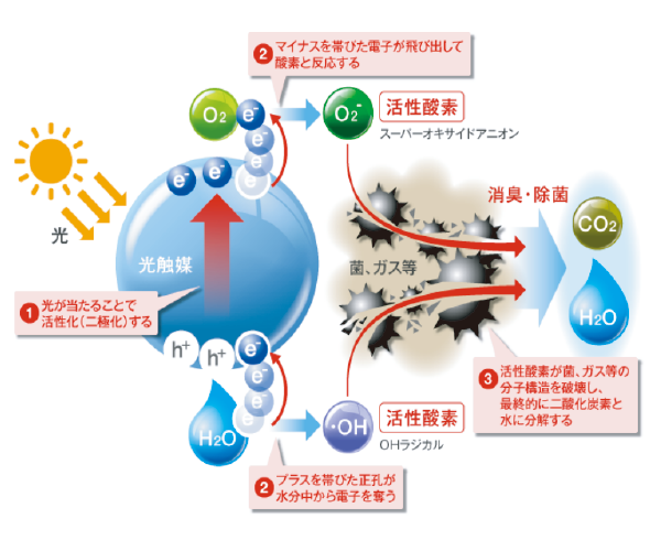 它氧化分解並消滅病毒和細菌蛋白質的部分膜。 該病毒具有覆蓋有蛋白質(有機物)薄膜的結構。 奈米塗層中復合的氧化鎢在光照下會產生活性氧。該活性氧氧化分解有機物。 當病毒沾附在奈米塗層的表面時,它會氧化分解一部分蛋白質膜並使病毒失去活性(消除其傳染性)。 細菌也有一個覆蓋著蛋白質細胞壁和細胞膜的結構,它們也被其中的一些氧化分解而消滅活性。